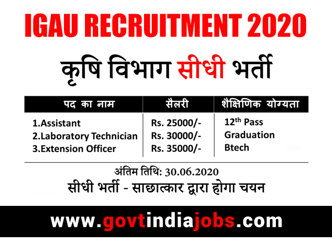 Interested and eligible candidates can apply online for the post of Assistant, Laboratory Technician, Extension officer, through official website of IGAU igau.edu.in on or before 30 June 2020.